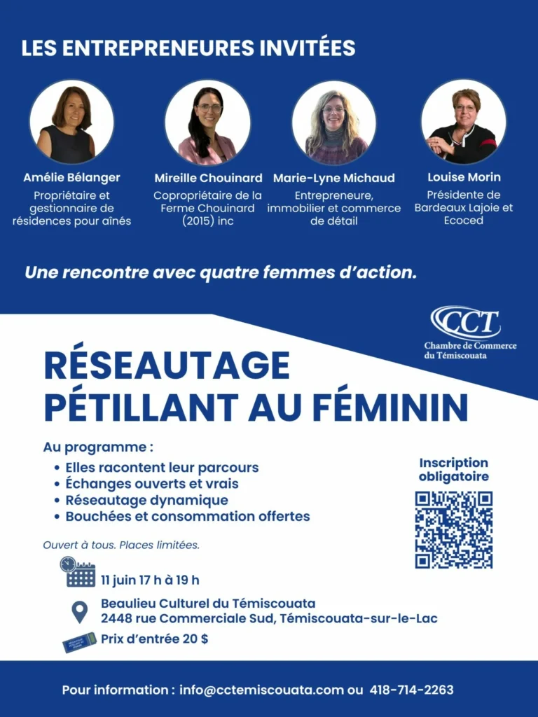 Quatre femmes d’affaires de la région viendront partager ce qui les a poussées à se lancer en affaires, les défis rencontrés, les décisions marquantes et la vision qui les guide au quotidien.